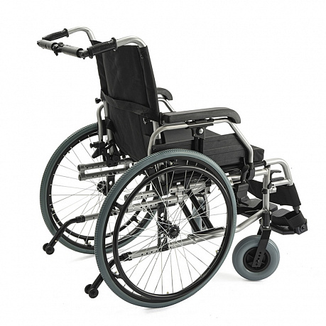- Адаптивность под пользователя: ширина сиденья 46 см, глубина — 42-50 см, а съемные подлокотники с регулировкой по высоте позволяют идеально подогнать коляску под анатомические особенности и потребности пользователя.